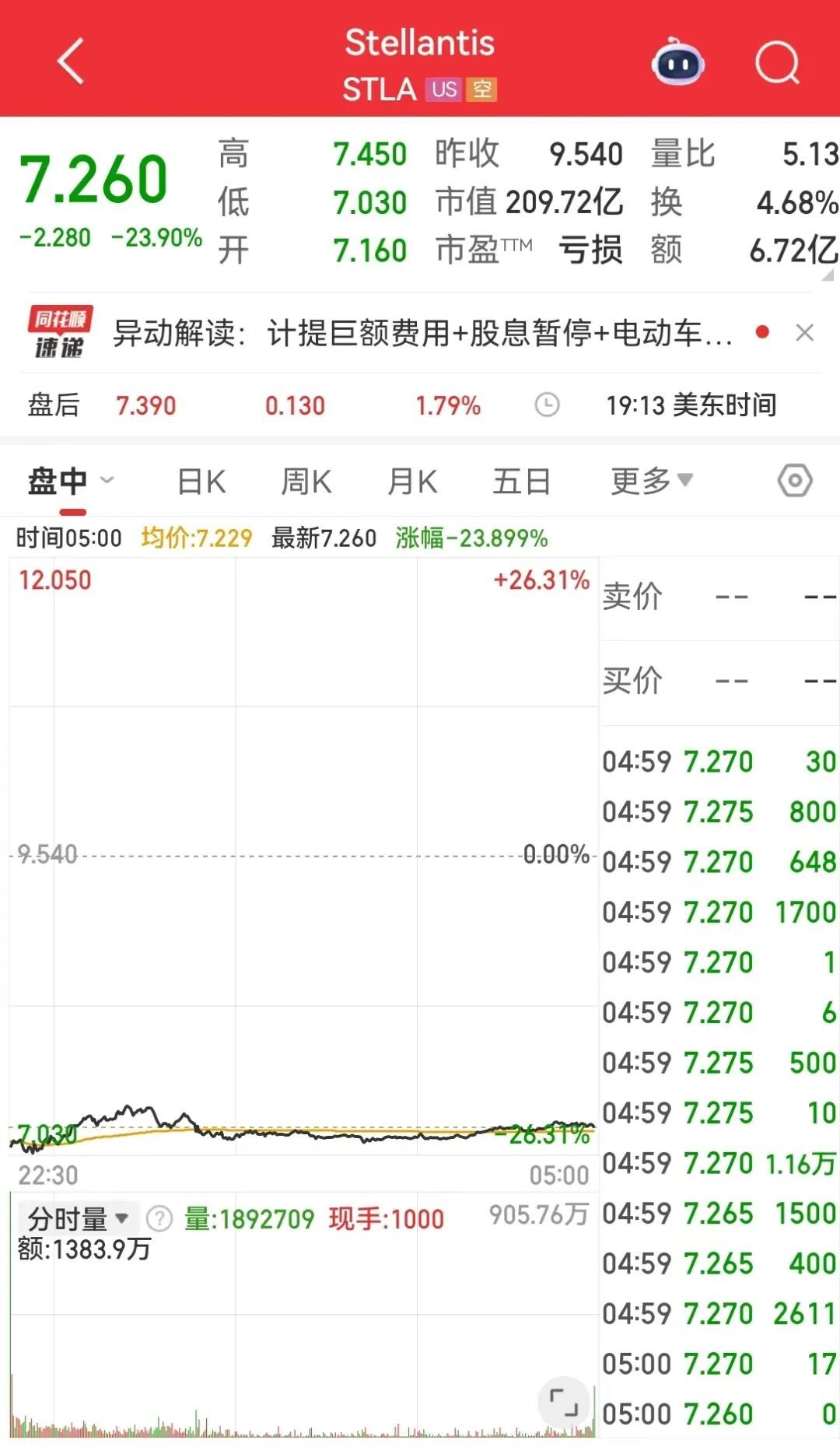 当地时间2月6日,全球第四大汽车制造商Stellantis集团(STLA.US)美股开盘后股价大幅下挫,盘中一度跌超26%,截至收盘跌23.79%。此前,该公司在法国市场的股价(STLAP.PA)一度暴跌近30%,当日收跌25.24%。